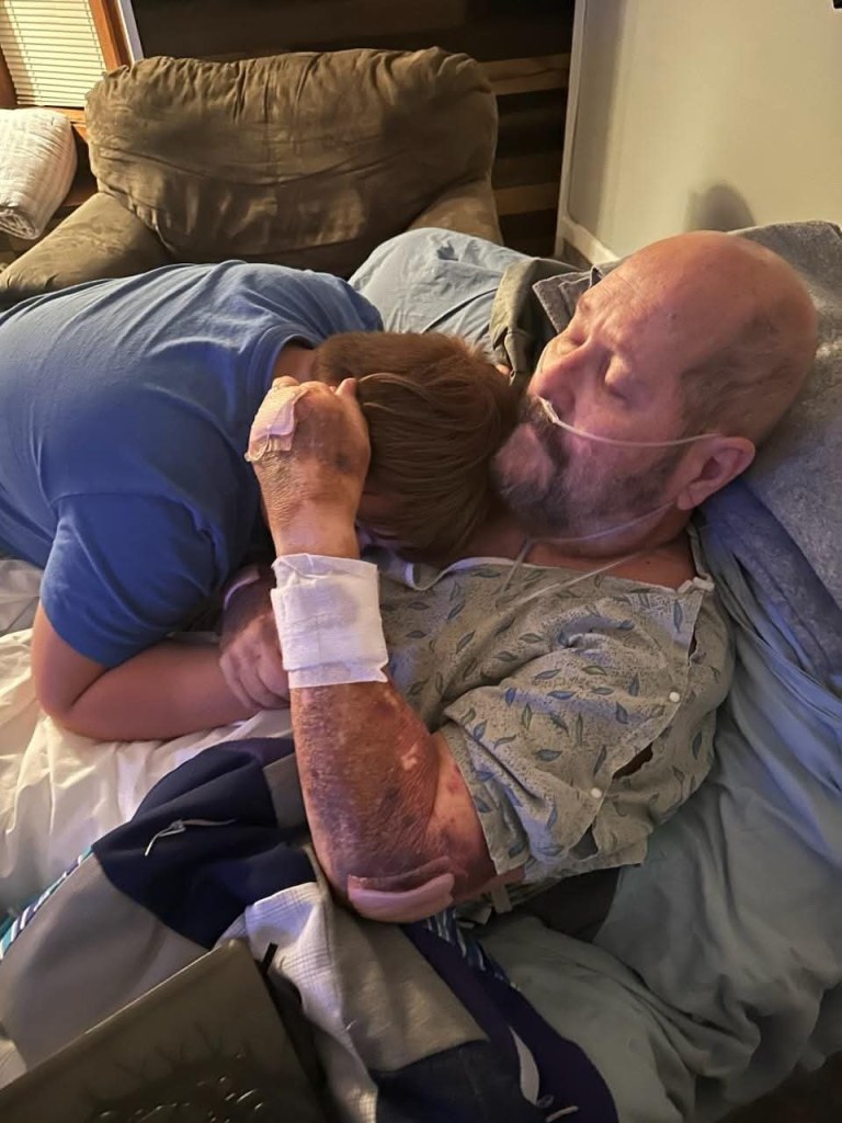 I stayed with him the night they opened his skull and took a tumor from his brain, replaced the skull and stitched him back together. I knew when he awoke because his breathing changed. Our eyes met and we gave each other a thumbs up.